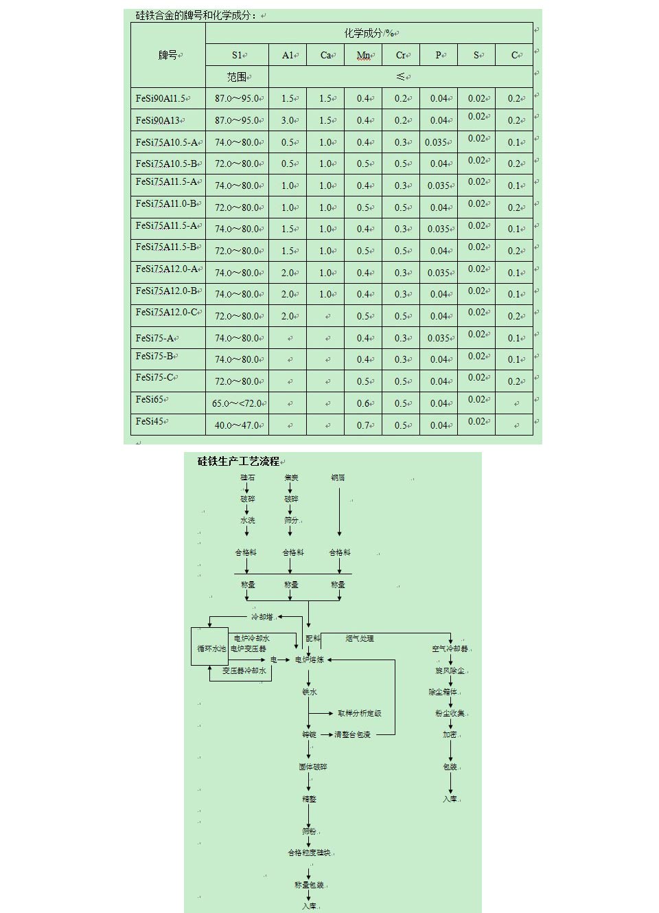 硅鐵是鐵和硅組成的鐵合金。 硅鐵是以焦炭、鋼屑、石英(或硅石)為原料,用電爐冶煉制成的鐵硅合金。由于硅和氧很容易化合成二氧化硅,所以硅鐵常用于煉鋼時作脫氧劑,同時由于SiO2生成時放出大量的熱,在脫氧的同時,對提高鋼水溫度也是有利的。同時,硅鐵還可作為合金元素加入劑,廣泛應用于低合金結構鋼、彈簧鋼、軸承鋼、耐熱鋼及電工硅鋼之中,硅鐵在鐵合金生產及化學工業(yè)中,常用作還原劑。硅鐵在鋼工業(yè)、鑄造工業(yè)及其他工業(yè)生產中被廣泛應用。 硅鐵是煉鋼工業(yè)中必不可少的脫氧劑。炬鋼中,硅鐵用于沉淀脫氧和擴散脫氧。磚坯鐵還作為合金劑用于煉鋼中。鋼中添加一定數量的硅,能顯著提高鋼的強度、硬度和彈性,提高鋼的磁導率,降低變壓器鋼的磁滯損耗。一般鋼中含硅0.15%-0.35%,結構鋼中含硅0.40%~1.75%,工具鋼中含硅0.30%~1.80%,彈簧鋼中含硅0.40%~2.80%,不銹耐酸鋼中含硅3.40%~4.00%,耐熱鋼中含硅1.00%~3.00%,硅鋼中含硅2%~3%或更高。 高硅硅鐵或硅質合金在鐵合金工業(yè)中用作生產低碳鐵合金的還原劑。硅鐵加入鑄鐵中可作球墨鑄鐵的孕育劑,且能阻止碳化物形成,促進石墨的析出和球化,改善鑄鐵性能。 此外,硅鐵粉在選礦工業(yè)中可作懸浮相使用,在焊條制造業(yè)中作焊條的涂料;高硅硅鐵在電氣工業(yè)中可用制備半導體純硅,在化學工業(yè)中可用于制造硅酮等。 在煉鋼工業(yè)中,每生產一噸鋼大約消耗3~5kg75%硅鐵。